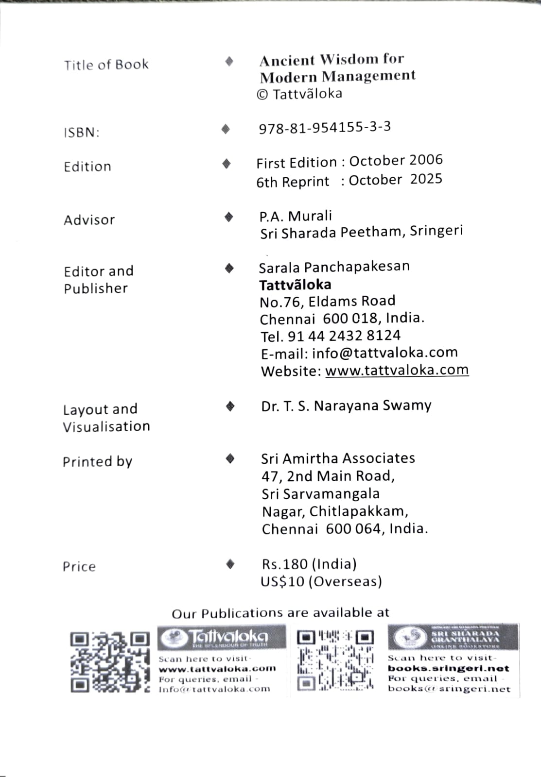 In this book is presented an overview of how management can benefit from the application of the principles of philosophical perceptions. The Anugraha Sandesa of His Holiness at the beginning sums up succinctly the values of management as recognized by our ancient texts. Stress is an inevitable accompaniment of management and has to be overcome. A couple of articles included here throw hints on ways to tackle this problem through yoga and other exercises.