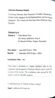 ನಮ್ಮ ನಿತ್ಯಪಠನಕ್ಕೆ ಸಹಕಾರಿಯಾಗುವಂತಹ , ಶೃಂಗೇರಿ ಜಗದ್ಗುರುಗಳಿಂದ ರಚಿಸಲ್ಪಟ್ಟಂತಹ ಶ್ರೀ ಶಾರದಾಂಬಾ, ಶ್ರೀಲಲಿತಾ ಪರಮೇಶ್ವರಿ, ಶ್ರೀ ಆದಿ ಶಂಕರಾಚಾರ್ಯ ಮತ್ತು ಶೃಂಗೇರಿ ಜಗದ್ಗುರುಗಳವರ ಅಷ್ಟೋತ್ತರ ಶತನಾಮಗಳು ಮತ್ತು ಸ್ತೋತ್ರಗಳು ಈ ಪುಸ್ತಕದಲ್ಲಿ ಸಂಗ್ರಹಿಸಲ್ಪಟ್ಟಿವೆ.