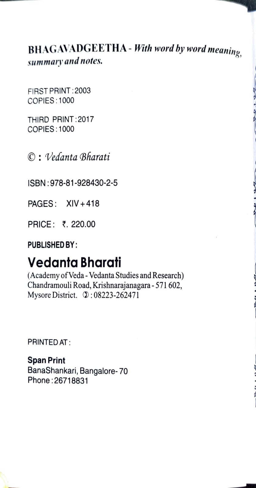 ಭಗವದ್ಗೀತಾ (ಮೂಲ, ಶಾಂಕರಭಾಷ್ಯಾನುಸಾರ ಪ್ರತಿಪದಾರ್ಥ, ತಾತ್ಪರ್ಯ, ಟಿಪ್ಪಣಿಯೊಂದಿಗೆ)