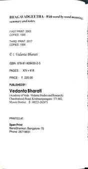 ಭಗವದ್ಗೀತೆಗೆ ದೊರಕುವ ವ್ಯಾಖ್ಯಾನಗಳಲ್ಲಿ ಶ್ರೀ ಶಂಕರಭಗವತ್ಪಾದರು ರಚಿಸಿದ ಭಾಷ್ಯವೇ ಮೊದಲಿನದೂ ಹಾಗೂ ಪರಿಪೂರ್ಣವೂ ಆಗಿದೆ. ಈ ಪುಸ್ತಕವು ಶಾಂಕರಭಾಷ್ಯಾನುಸಾರಿಯಾದ ಪ್ರತಿಪದಾರ್ಥವನ್ನು ಒಳಗೊಂಡಿದ್ದು, ವೇದಾಂತಭಾರತೀಯಿಂದ ಪ್ರಕಟಗೊಂಡು, ಕನ್ನಡಿಗರಿಗೆ ಓದಲು ಸಹಕಾರಿಯಾಗಿದೆ.