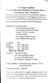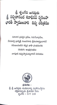 సుమారు 40 సంవత్సరములు (1891-1931), శృంగేరి మహాసంస్థానమునకు సర్వాధికారిగానుండి, జగద్గురువుల అపార కరుణకు పాత్రులైన నంజనగూడు శ్రీకంఠశాస్త్రిగారు, కన్నడములో వ్రాసి, 1924 లో ముద్రించిన పుస్తకమును, శ్రీ నాగపూడి కుప్పుస్వామయ్యగారు 1932లో అంధ్రీకరించినారు. 33వ ఆచార్యుల చరిత్రమును కమనీయముగా తెలియజెప్పే పుస్తకము ఇది. చదువరులు వారి దివ్య చరిత్రను తెలుసుకొని పులకితులవుదురుగాక.