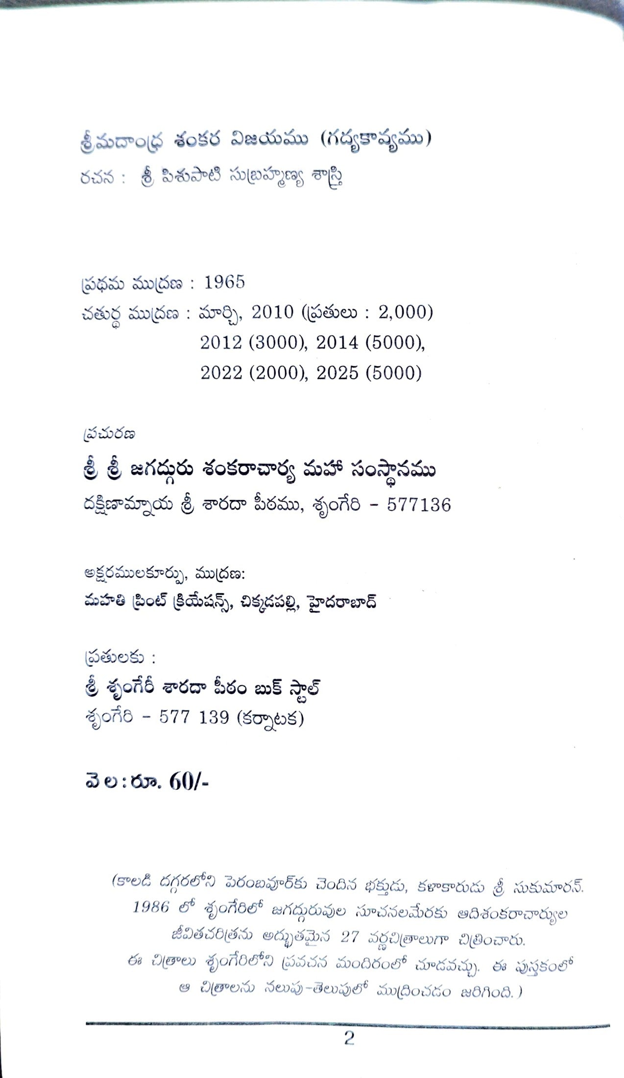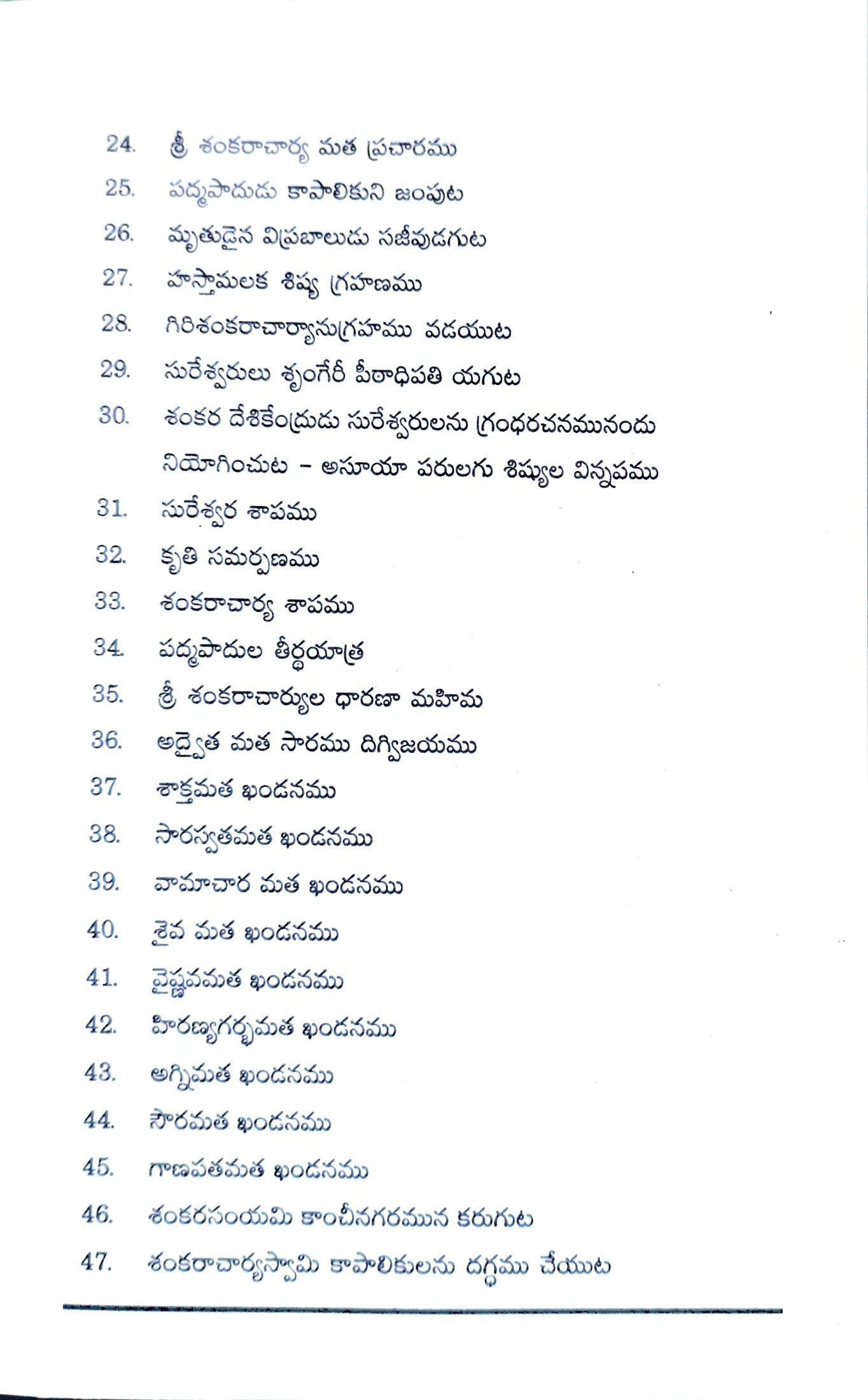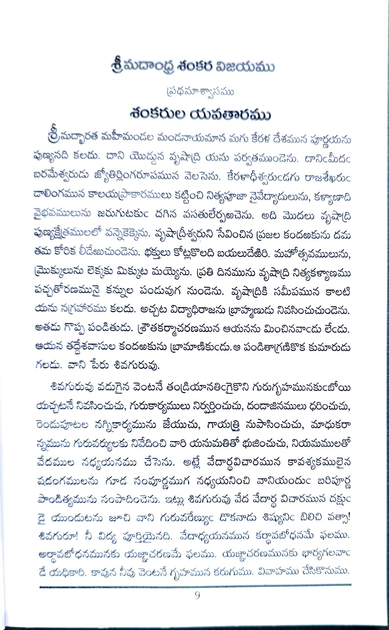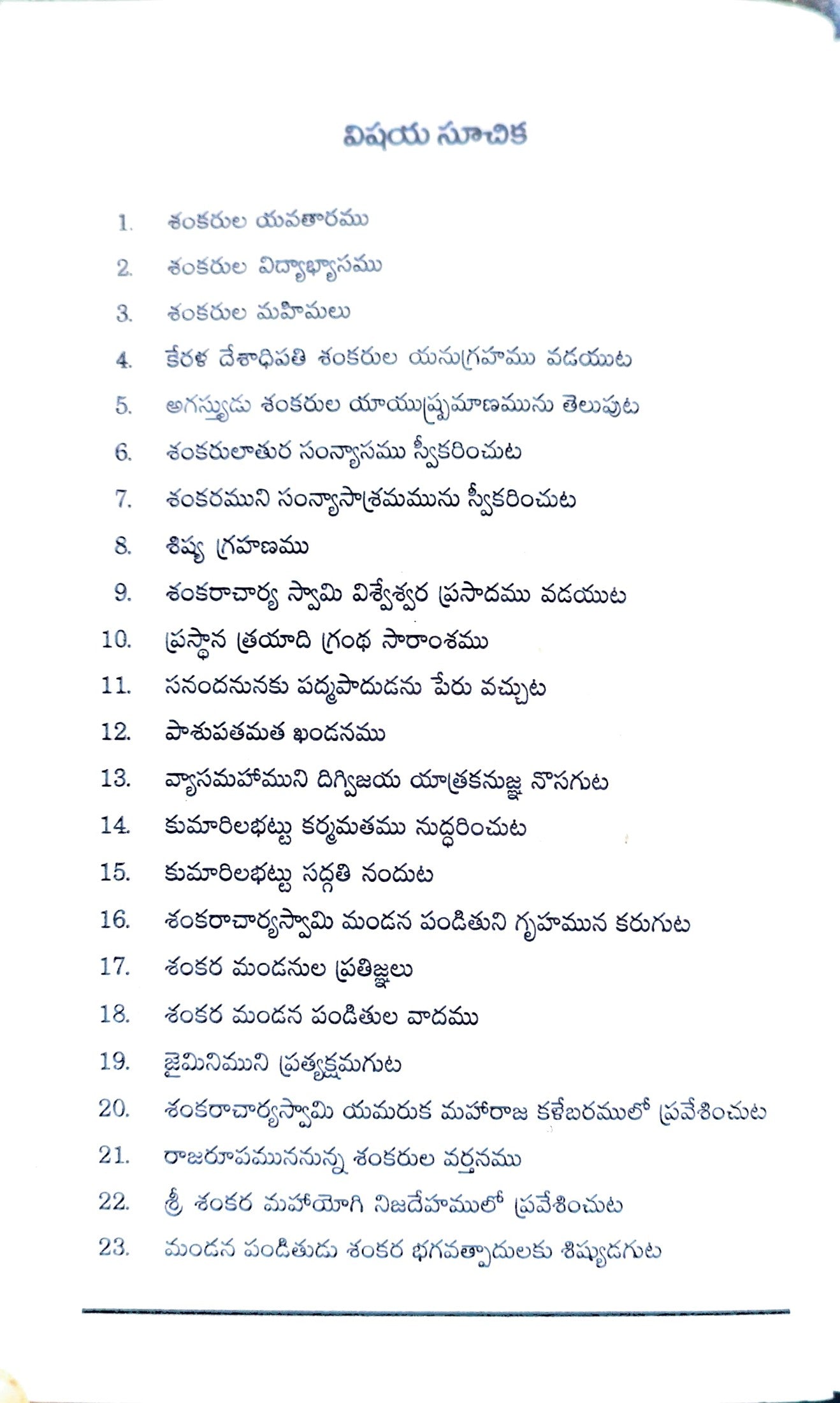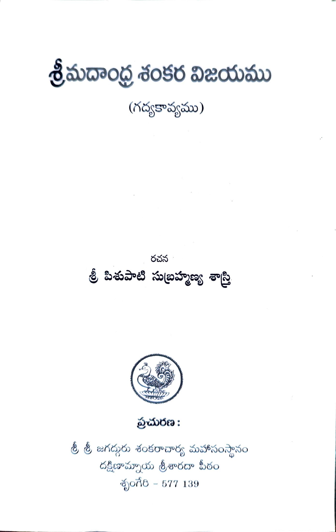 ఈ పుస్తకము శ్రీ పిశుపాటి సుబ్రహ్మణ్య శాస్త్రిగారిచే రచింపబడినది. 1965లో ప్రథమ ముద్రణకు నోచుకొని తరువాత పలుమార్లు పునర్ముద్రింపబడినది. శ్రీ విద్యారణ్యులవారి, శకరవిజయమునకు తెలుగు గద్య అనువాదముగా దీనిని గుర్తించవచ్చు. కొంచము చిక్కని తెలుగులో వ్రాయబడిన ఈ గ్రంథము, ఆదిశంకరుల జీవిత చరిత్రను చక్కగా తెలియబరుస్తుంది.