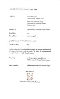 शृंगेरी की महानता एक महत्वपूर्ण ग्रन्थ है, जिसमें शृंगेरी क्षेत्र, श्री शारदा पीठ तथा उसकी गौरवशाली जगद्गुरु परम्परा का क्रमबद्ध और प्रामाणिक वर्णन किया गया है। इस पुस्तक में शृंगेरी के धार्मिक, सांस्कृतिक और आध्यात्मिक महत्व के साथ-साथ आदि शंकराचार्य, उनके शिष्यगण, उत्तरवर्ती आचार्य तथा वर्तमान जगद्गुरु शंकराचार्यों के जीवन, कार्य और योगदान का विस्तार से परिचय दिया गया है। प्रारम्भिक, मध्यकालीन एवं उत्तरकालीन आचार्यों के माध्यम से शृंगेरी पीठ की अखण्ड परम्परा को स्पष्ट किया गया है। परिशिष्ट में शृंगेरी जगद्गुरु परम्परा, आचार्यों की रचनाएँ तथा प्रमुख स्तोत्रों का समावेश इस ग्रन्थ की उपयोगिता को और बढ़ाता है। यह पुस्तक शृंगेरी मठ की महानता को समझने के इच्छुक पाठकों, विद्यार्थियों और साधकों के लिए अत्यंत उपयोगी और प्रेरणादायक है।
