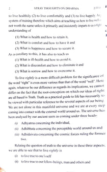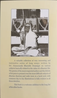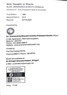 Stray Thoughts on Dharma is a simple and meaningful book by Sri Jnanananda Bharathi Swamigal. It contains essays that explain the importance of living a dharmic and moral life. The author explains difficult ideas from Dharma Shastras and Vedic texts in an easy and clear way, using examples from everyday life. This book is helpful and enjoyable for readers who want to understand dharma in a practical and simple manner.